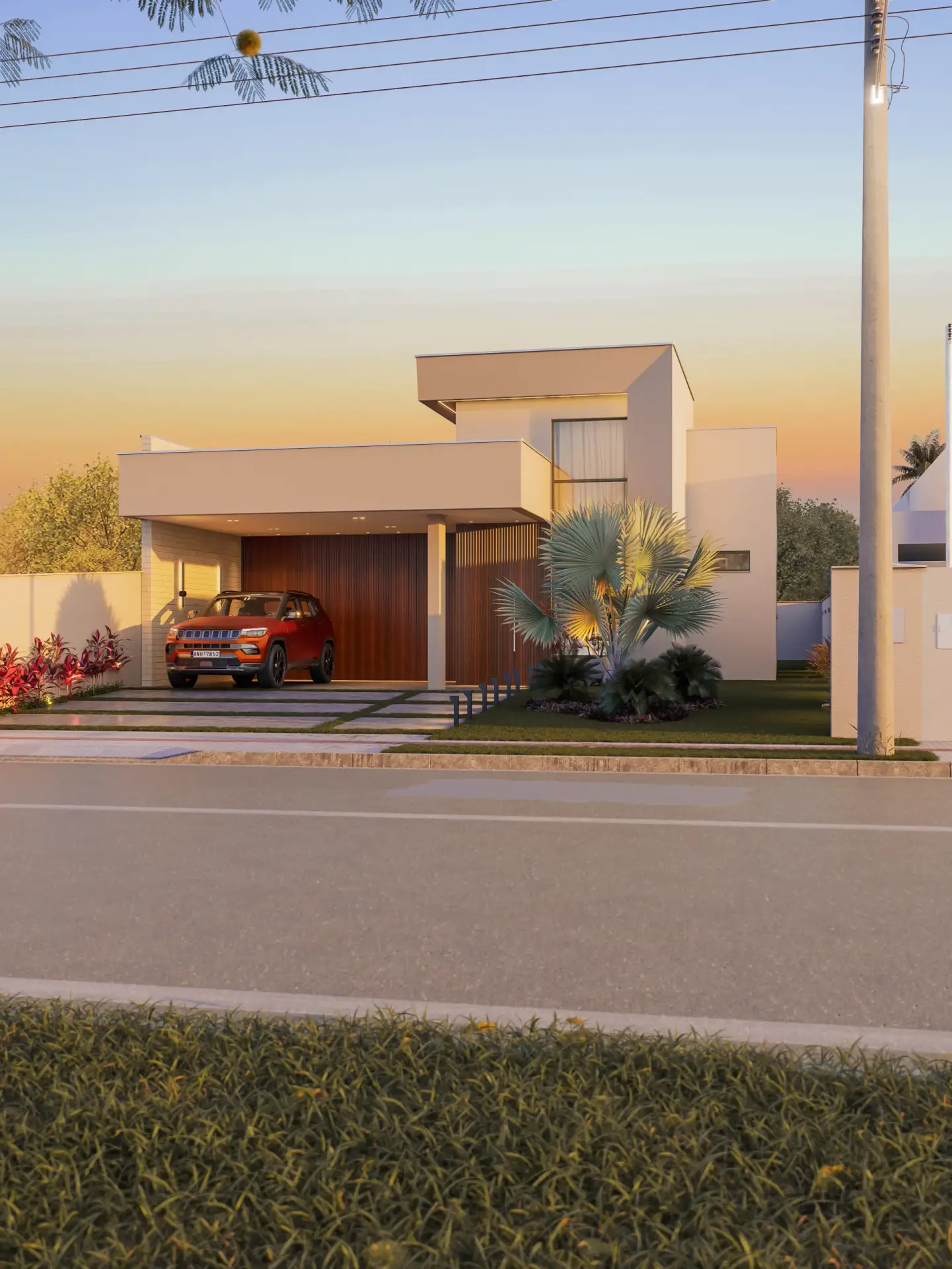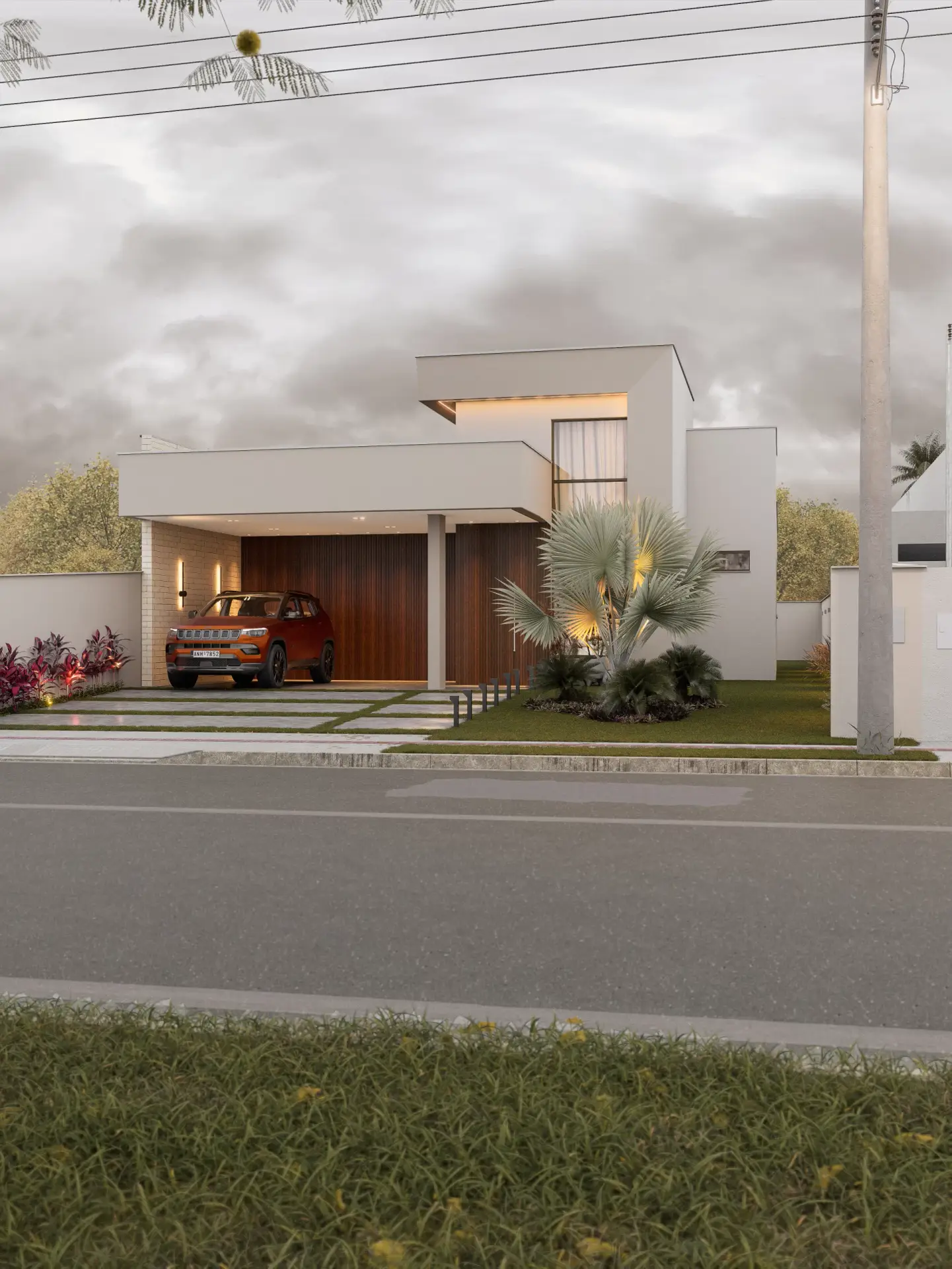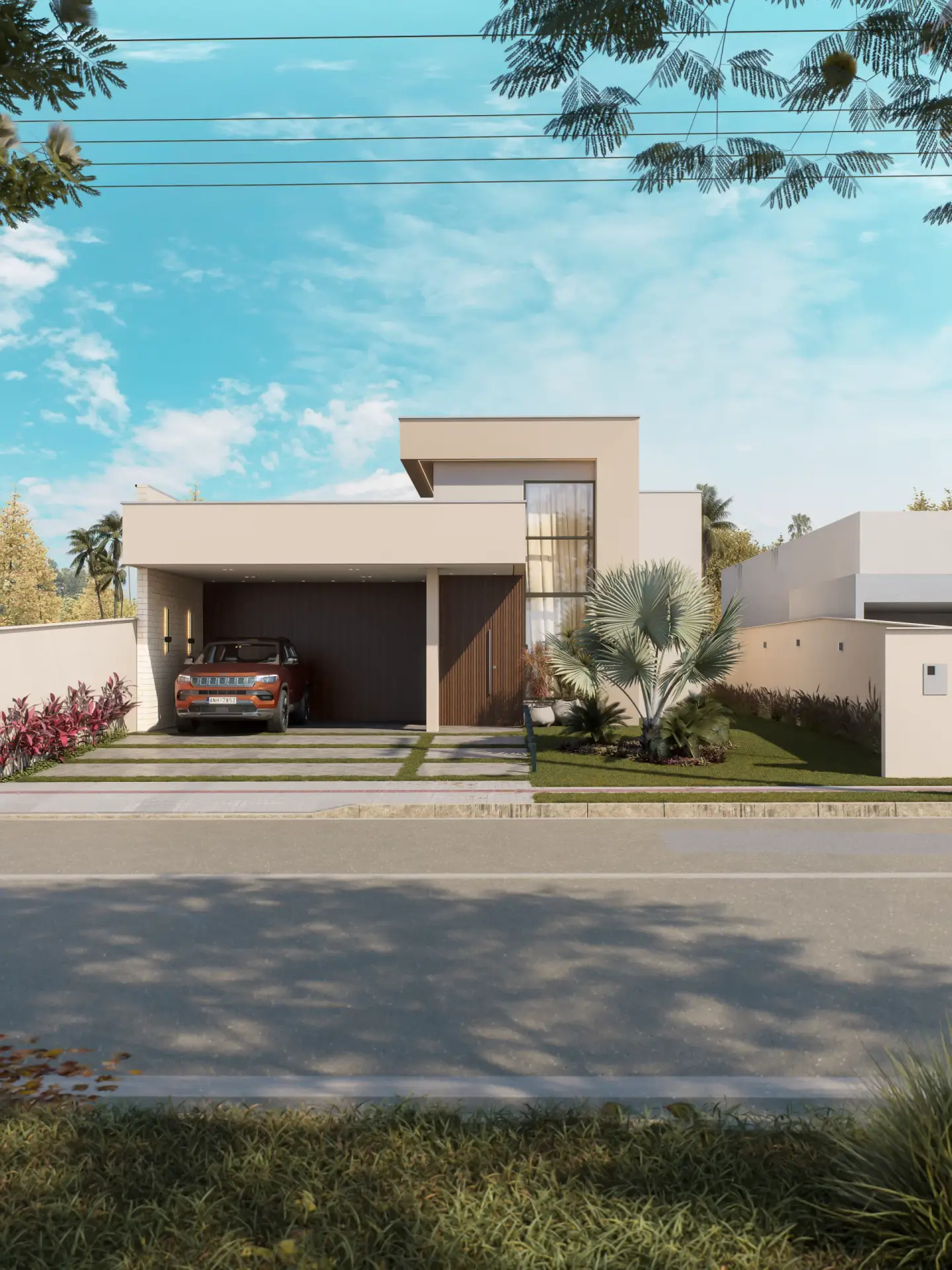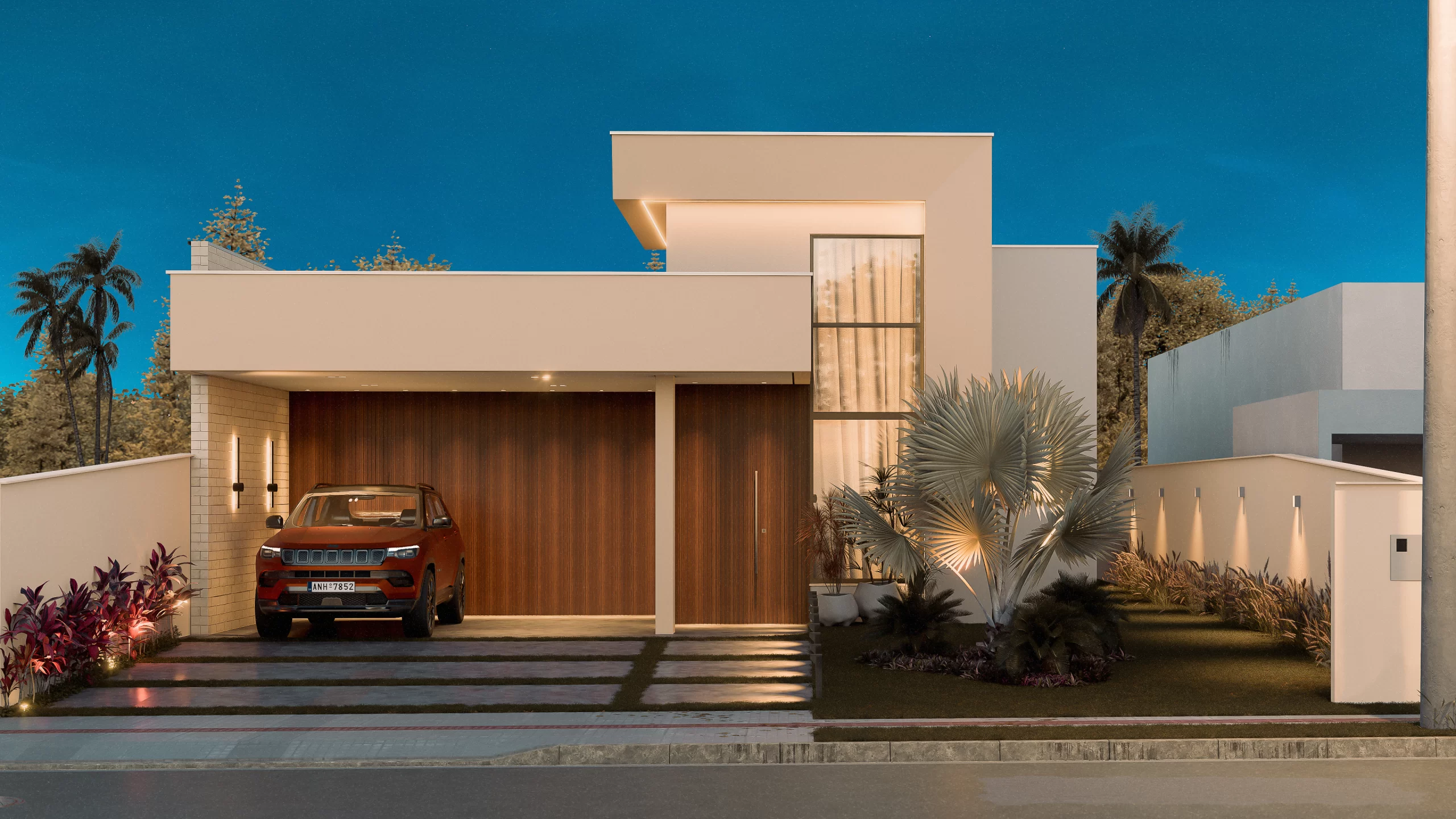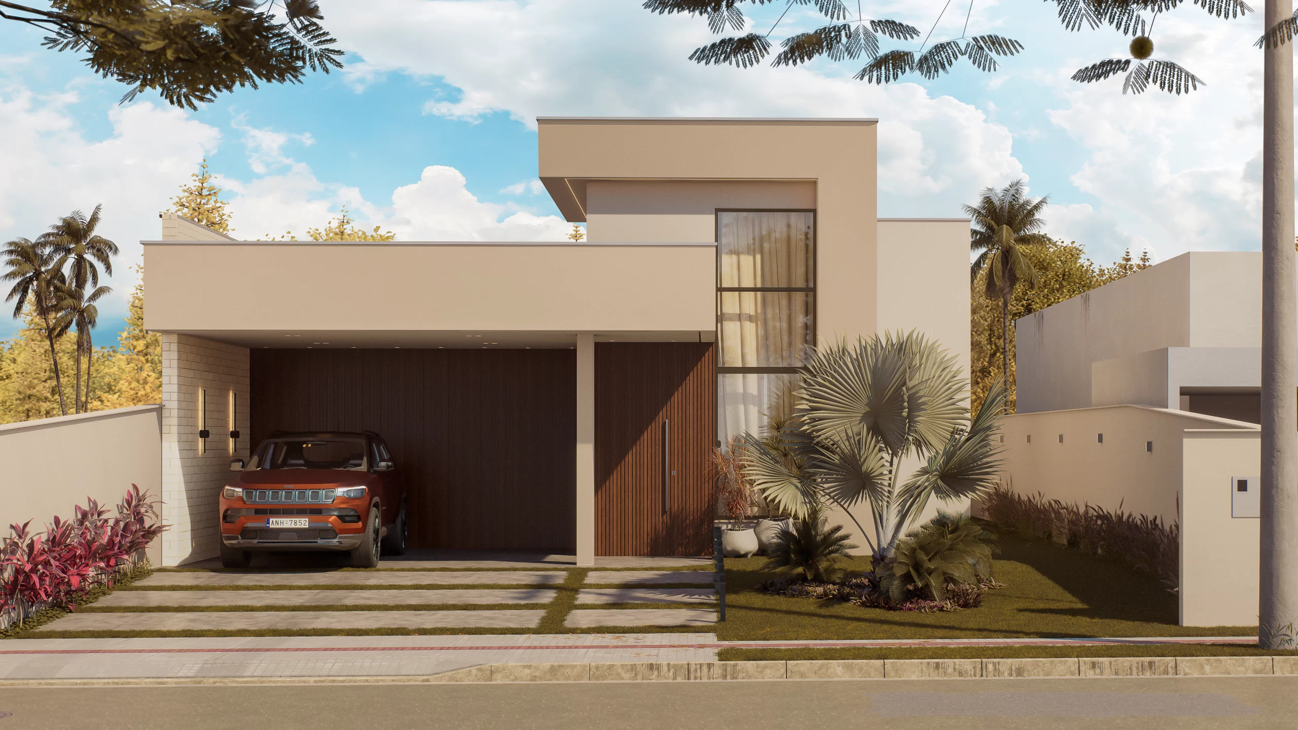 Planejado em pavimento único, o projeto soluciona a disposição da casa em um terreno predominantemente plano, e permite a utilização de todo ambiente externo para jardins, acessos e lazer. Sua horizontalidade, torna a casa elegante e leve, sendo um dos destaques para o projeto compacto.